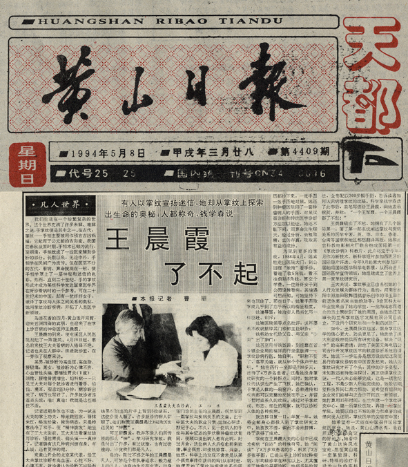 1994年4月5日《东方城乡报》“神医王晨霞再度来泸掌上诊病”上海筹建国际掌纹研究中中心。