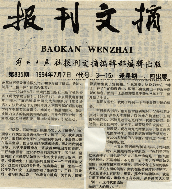 1994年7月7日《报刊文摘》刊登“掌纹诊病奇人奇事”